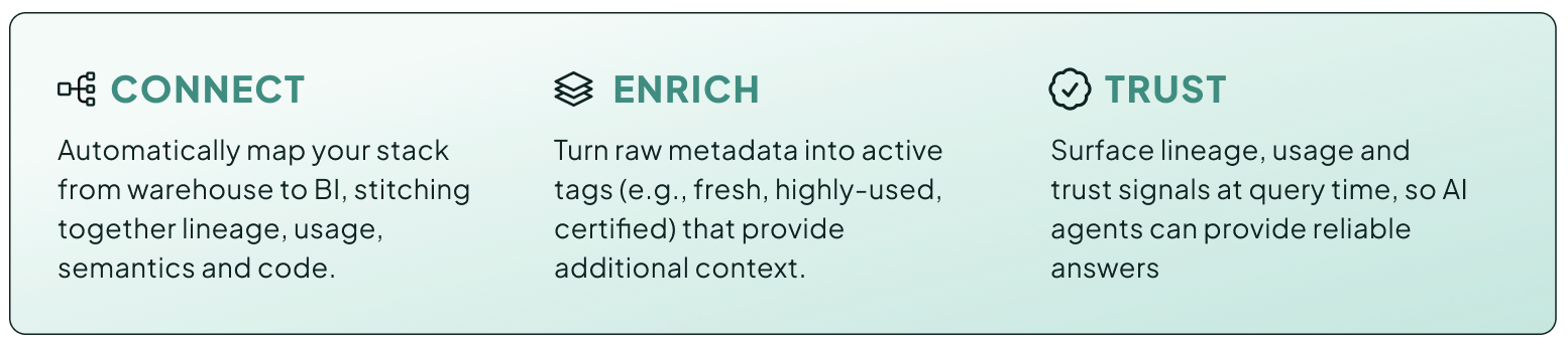It maps your existing metadata—stitching together column-level lineage across warehouses, dashboards, and metrics, enriched with field-level usage to highlight what matters, and custom properties with automated rule based labels or tags. Then it activates this metadata: enabling data teams to declutter, cut costs, and automate governance at scale, while surfacing the real-time context AI agents need to understand the data and deliver trusted results—every time.