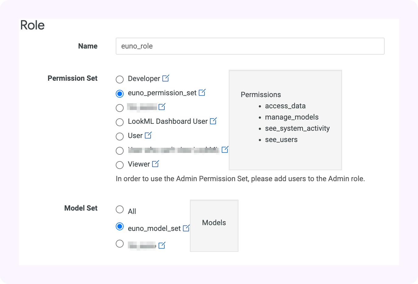 3. Name the new Model Set `euno_model_set`. Do not check any of the LookML models. Euno's Looker integration does not require access to any LookML model.