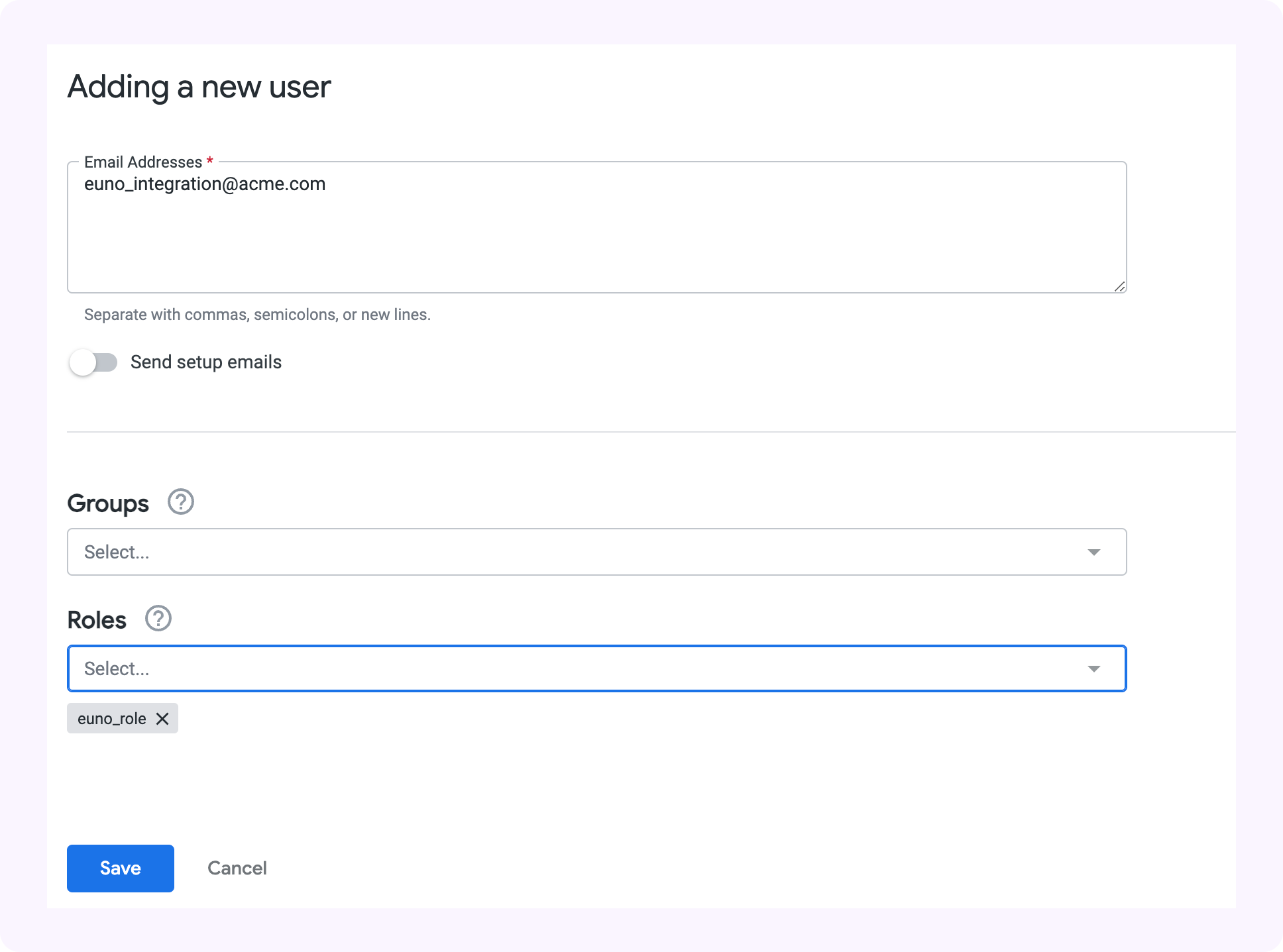 2. Give the user an email address and assign the role `euno_role`, then click "Save"