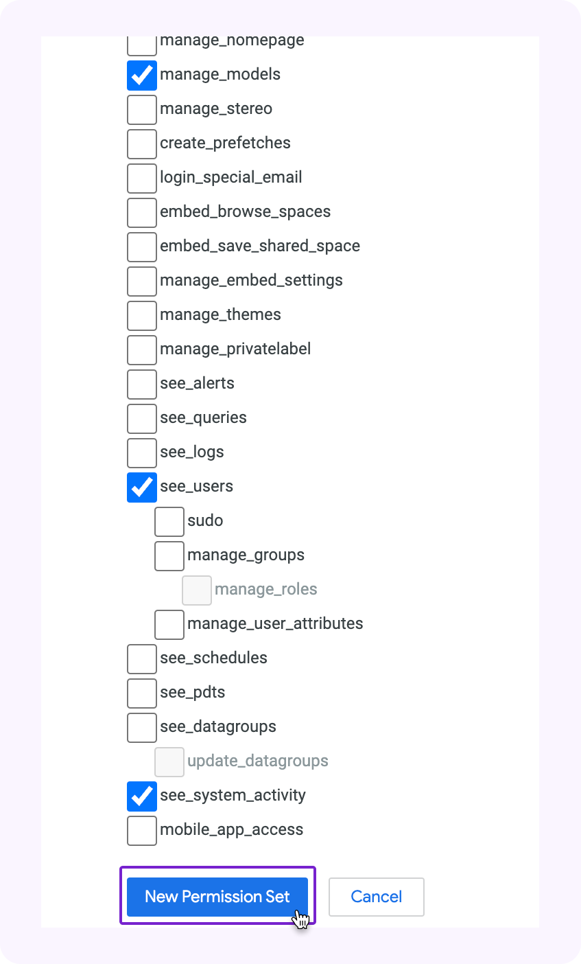 <figure><img src="https://3442486607-files.gitbook.io/~/files/v0/b/gitbook-x-prod.appspot.com/o/spaces%2Fjd87LSzdZm6uu6WlpVMg%2Fuploads%2Fgit-blob-95339ba464c9a91aa49916dd3ac8ffb9d981ea20%2Fimage%20(5)%20(1)%20(1)%20(2)%20(1).png?alt=media" alt="" width="375"><figcaption><p>Looker: Save Permission Set</p></figcaption></figure>